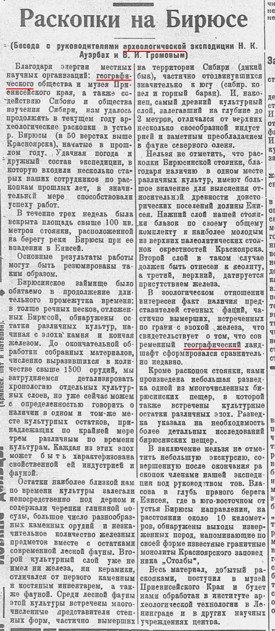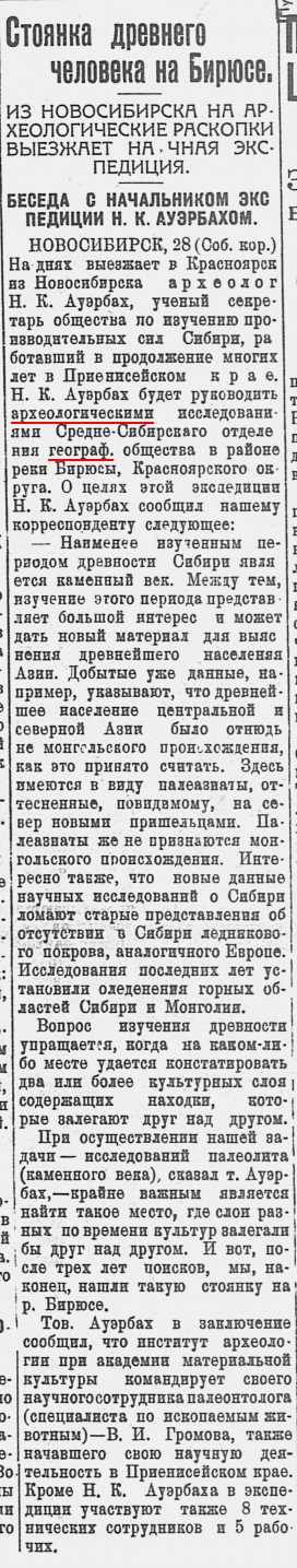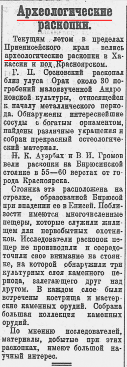 Археологические раскопки на Бирюсе в те годы освещались в печати.